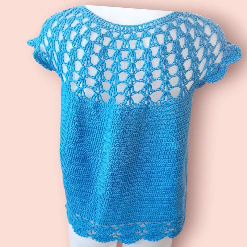 Blouse au crochet fait main avec 20% de lin ce qui permet d'absorber l'humidité de la transpiration.